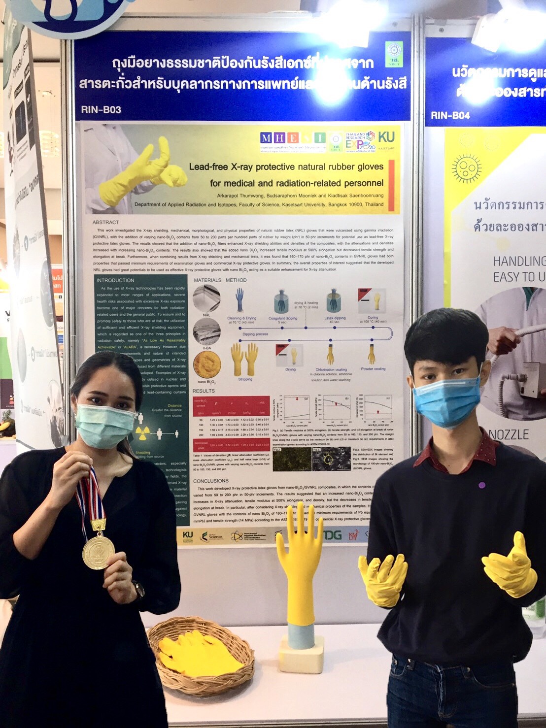 ผลงานนวัตกรรมถุงมือยางธรรมชาติป้องกันรังสีเอกซ์ที่ปราศจากสารตะกั่วสำหรับบุคลากรทางการแพทย์และผู้ใช้งานด้านรังสี โดยนายอัครพล ทุมวงศ์ นางสาวบุษราภรณ์ มูลเหล็ก และรองศาสตราจารย์ ดร.เกียรติศักดิ์ แสนบุญเรือง ในงานประกวดผลงานนวัตกรรมสายอุดมศึกษา ประจำปี ๒๕๖๓ ได้รับรางวัลระดับเหรียญทอง